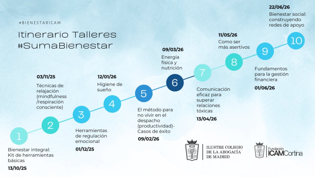 A través del Programa de Bienestar Integral ICAM, la Fundación ICAM Cortina pone a disposición de todos los colegiados del ICAM un amplio itinerario formativo de talleres bienestar para dotar a los profesionales de derecho de las herramientas necesarias para que puedan cuidar de su bienestar integral y salud mental.